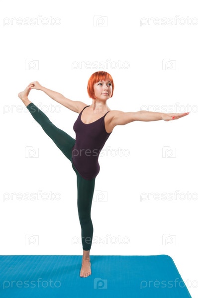 Рыжеволосая девушка занимается йогой на белом фоне