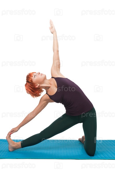 Рыжеволосая девушка делает упражнения из йоги на белом фоне