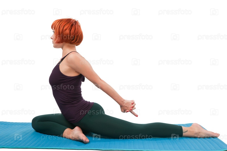 Рыжеволосая девушка растягивается на белом фоне