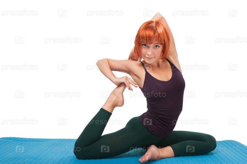 Гибкая рыжеволосая девушка на белом фоне