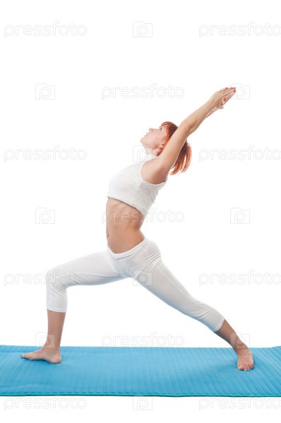 Девушка в белом занимается калланетикой на белом фоне
