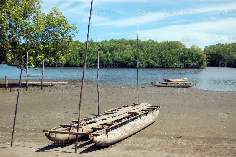 Деревянное каноэ на берегу реки