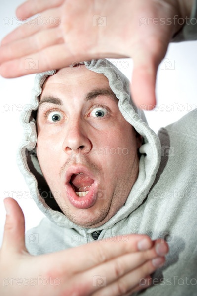 Мужчина делает рамку руками
