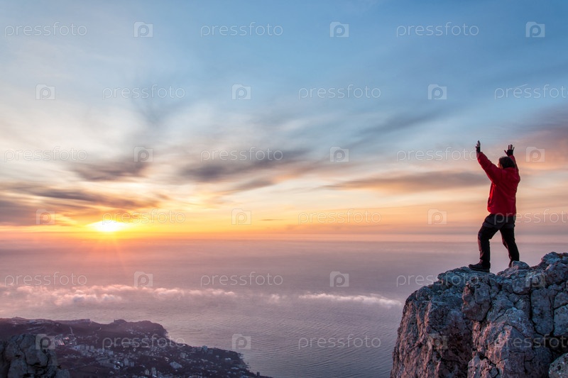Человек на вершине горы с распростертыми руками