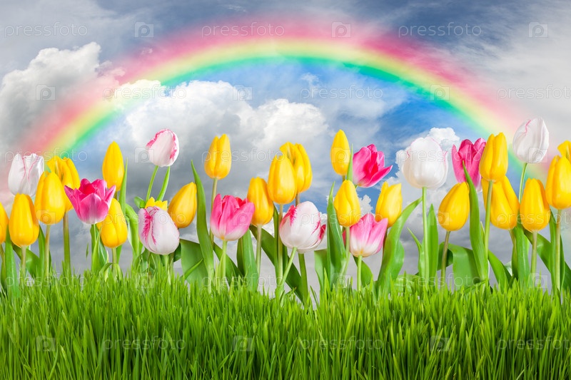 Пейзаж с тюльпанами и радугой