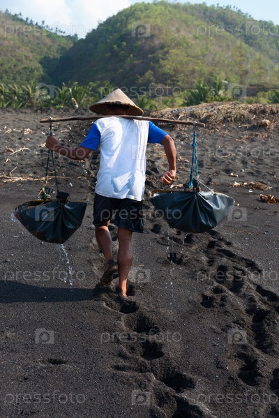 Производство традиционной морской соли на на вулканическом черном песке, Бали, Индонезия