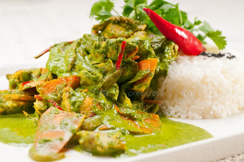 Курица с зелеными овощами с карри и рисом