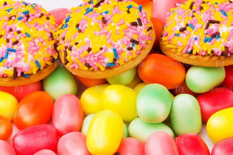Сладкие торты и красочные жвачки на заднем плане