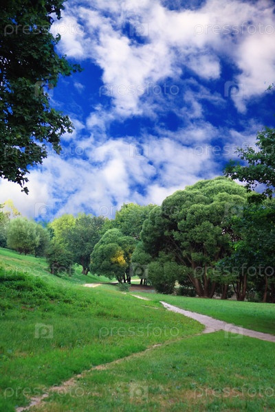 Тропинка в зеленый лес на фоне неба