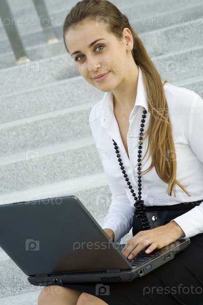 Деловая девушка с ноутбуком на лестнице