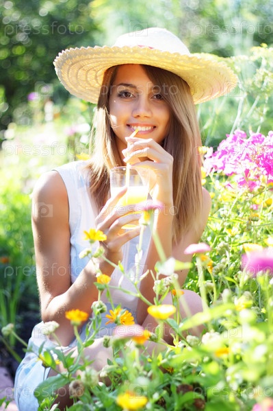 Девушка в соломенной шляпе пьет сок на цветочной поляне