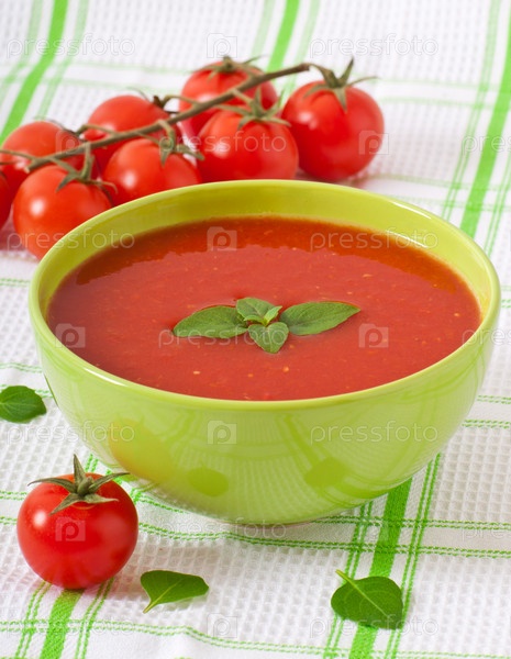 Традиционный горячий свежий диетический томатный суп с базиликом