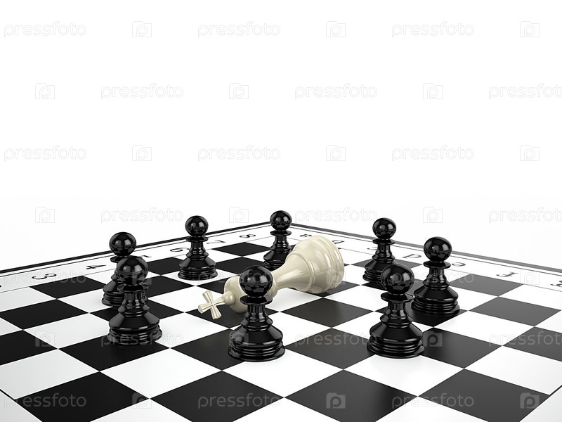 Белый шахматный король лежит в окружении черных пешек на шахматной доске