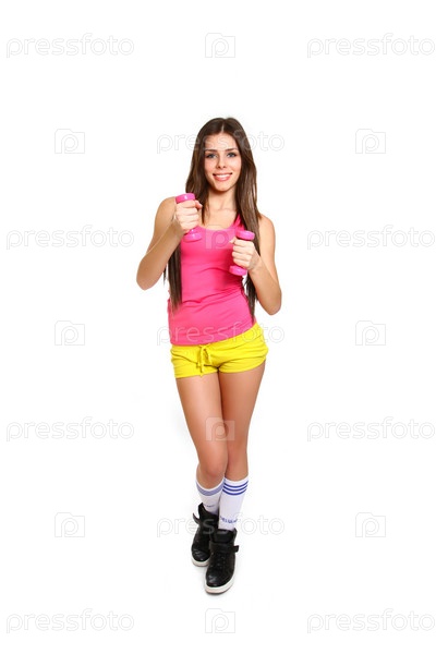 Здоровая женщина занимается с гантелями, изолированная на белом фоне