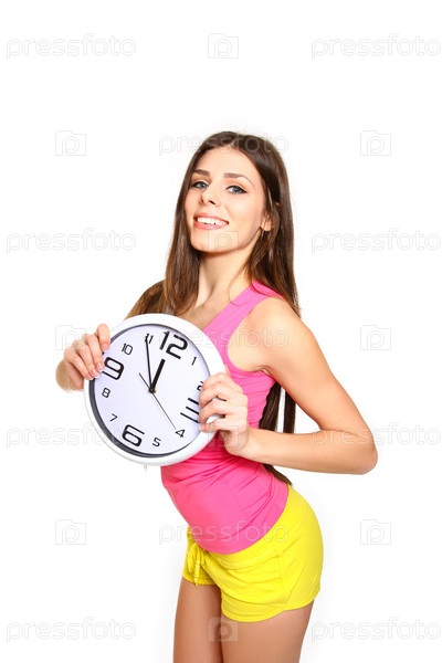 Портрет молодой женщины с часами на белом фоне. Время спорта