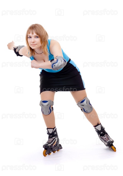Девушка на роликовых коньках, изолированная на белом фоне