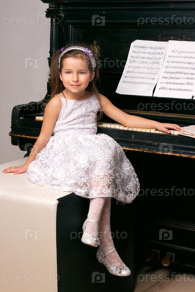 Симпатичная 5-летняя девочка сидит у фортепиано