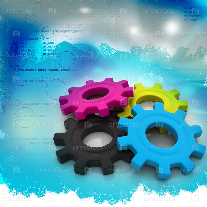 Зубчатые колеса в гамме CMYK на абстрактном фоне