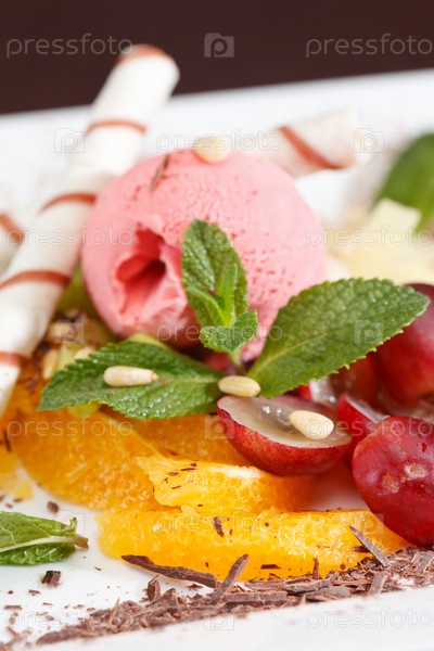 Вкусный десерт с мороженым и фруктами