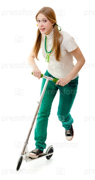 Девушка на самокате, изолированная на белом фоне