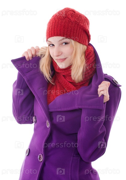 Девушка в пальто и вязаной шапке с шарфом, изолированная на белом фоне