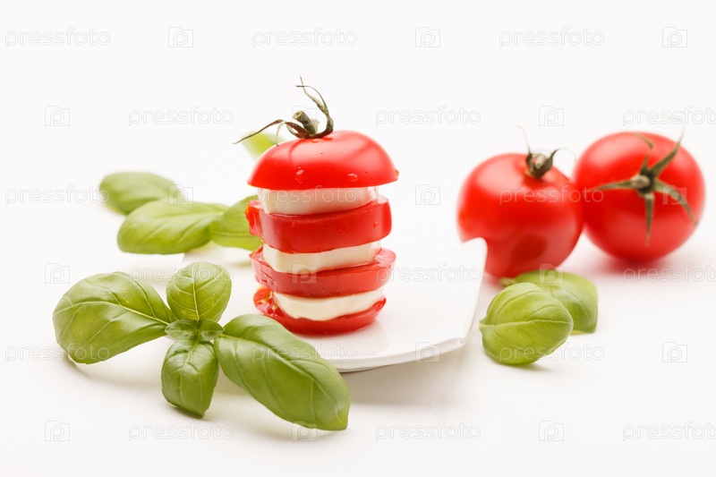 Помидор и сыр моцарелла, украшенные листьями базилика