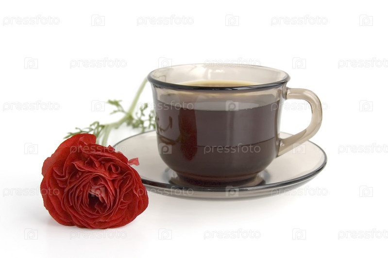 Чашка с блюдцем из коричневого стекла с горячим кофе и красным цветком, изолированно на белом фоне