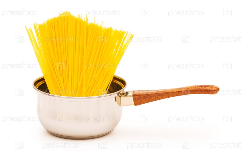 Спагетти в ковше на белом фоне