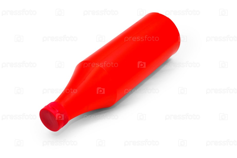 Красная пластиковая бутылка для кетчупа, изолированная на белом фоне