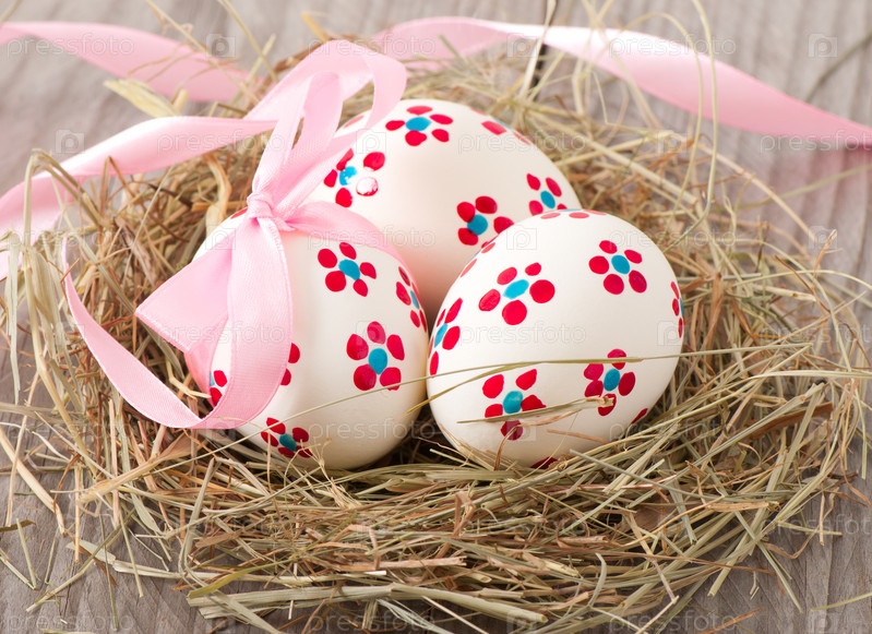 Пасхальные яйца в гнезде, в миске, на деревянном столе