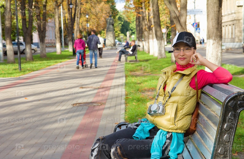 Красивая азиатская туристка, сидящая на скамье