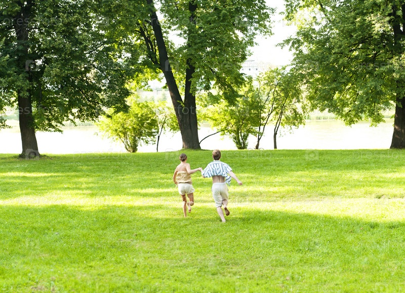 Счастливая молодая пара бежит в парке