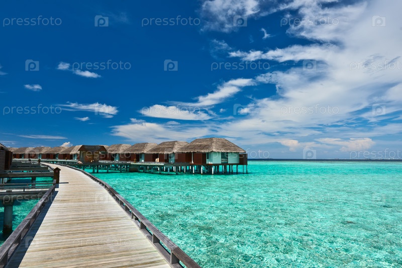 Красивый пляж с водными бунгало