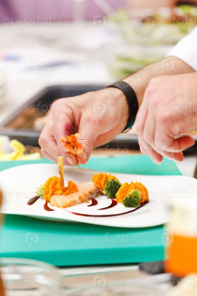 Профессиональный шеф-повар оформляет вкусное блюдо