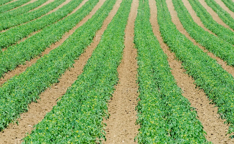 Поле помидоров в яркий летний день