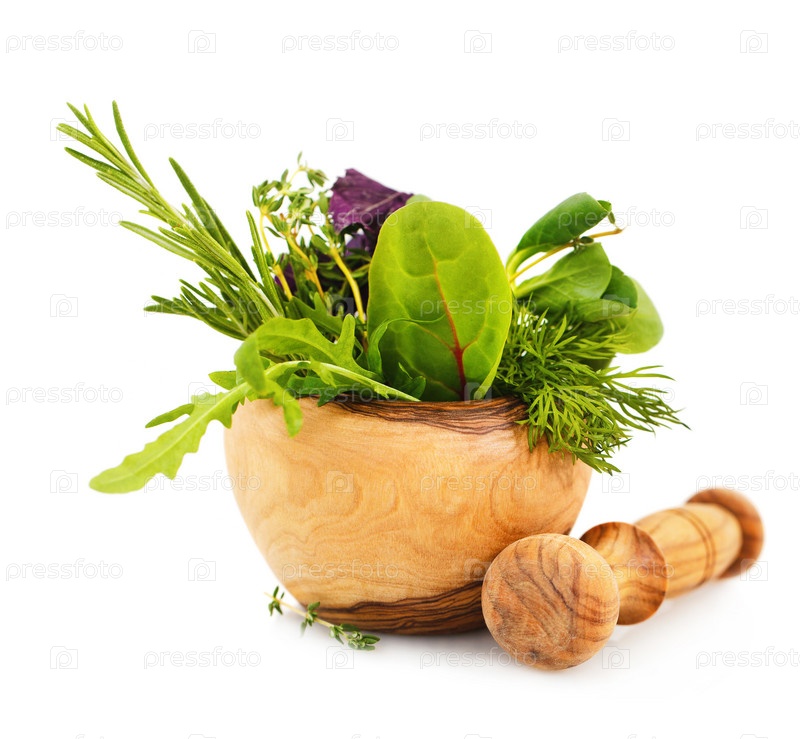 Ступка со свежей зеленью, изолированная на белом