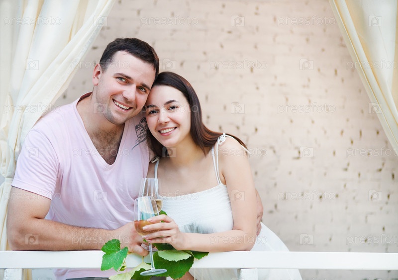 Молодая счастливая пара наслаждается вином на терассе