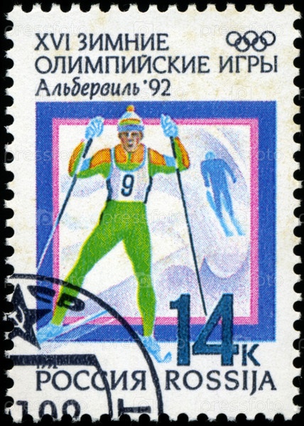 Румынская почтовая марка 1992 года, лыжные гонки и Олимпийские кольца с надписью «Альбервиль, 1992 год»