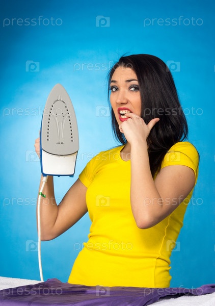 Домохозяйка с кучей одежды для глажки