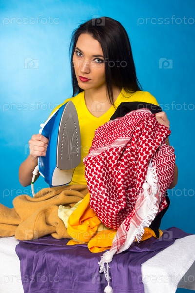 Домохозяйка с кучей одежды для глажки