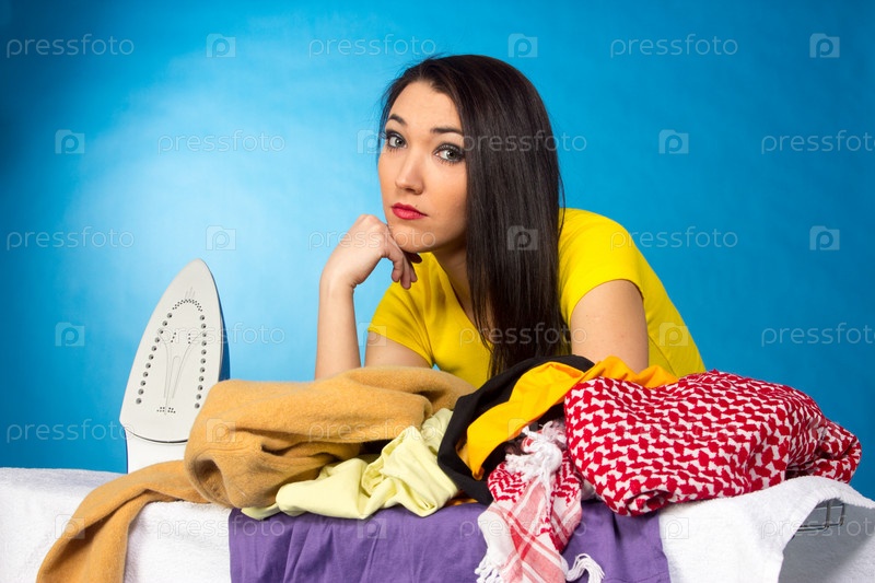 Домохозяйка с кучей одежды для глажки