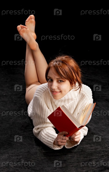 Красивая девушка в свитере читает книгу на черном фоне