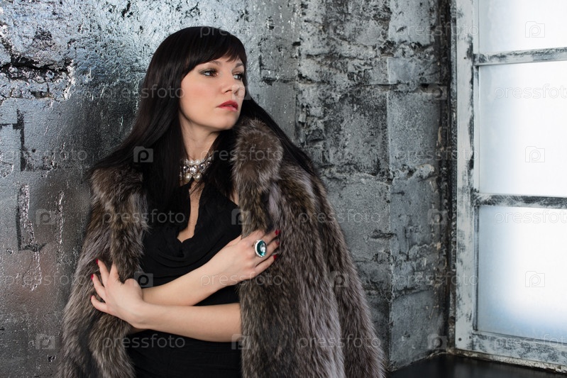 Великолепная молодая женщина в шубе стоит у окна