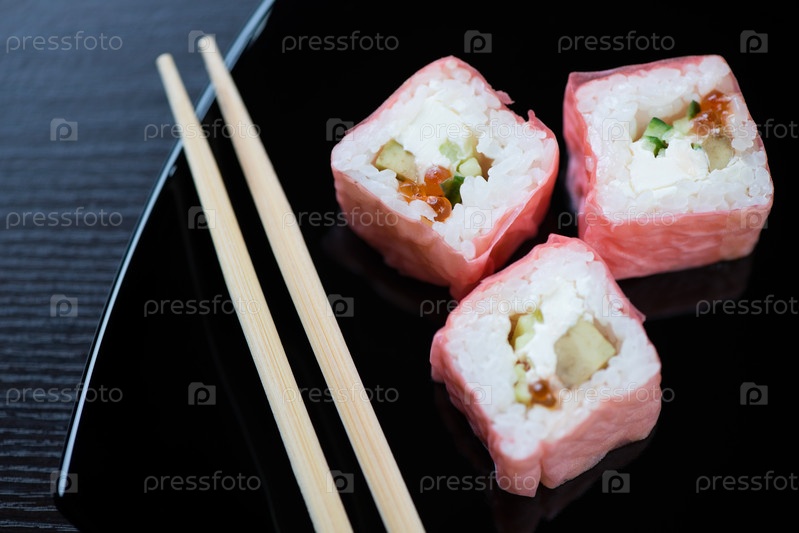 Суши и палочки для еды на черной тарелке