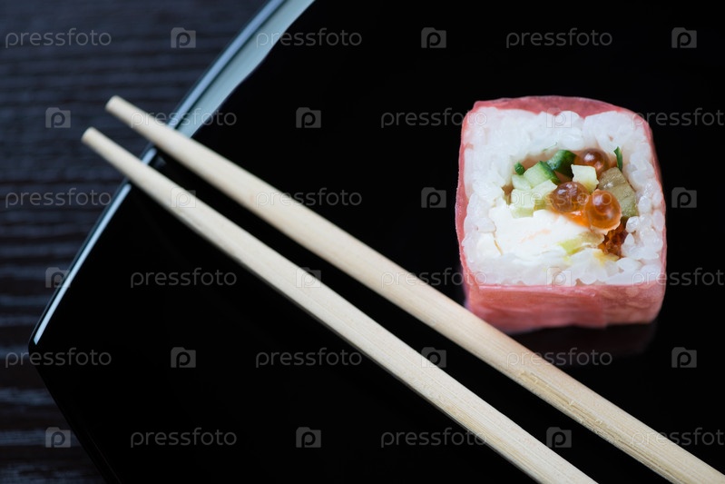 Суши и палочки на черной тарелке