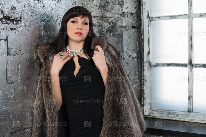 Стильная молодая женщина в шубе возле окна