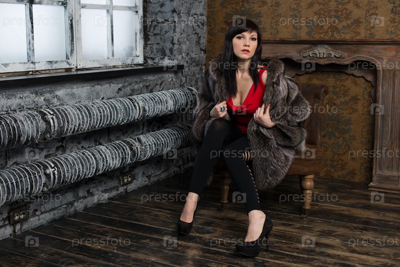 Стильная молодая женщина в шубе позирует в старинном интерьере