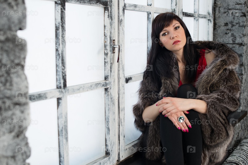Красивая молодая женщина в шубе сидит на подоконнике