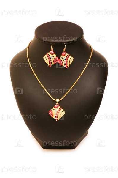 Красивые серьги и колье на белом фоне