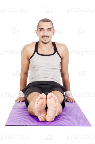 Мужчина делает упражнения на белом фоне